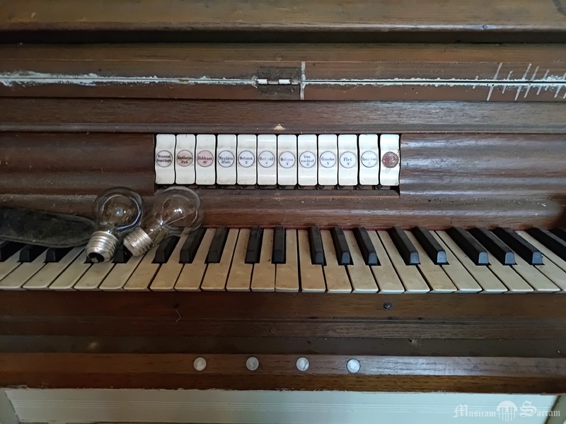 Instrument nieczynny od ponad 20 lat. Stół gry wbudowany w lewy bok szafy organowej. Brak klawiatury pedałowej.