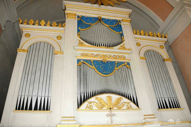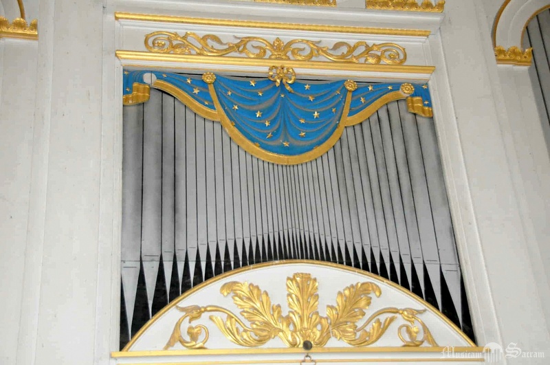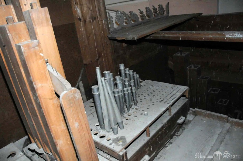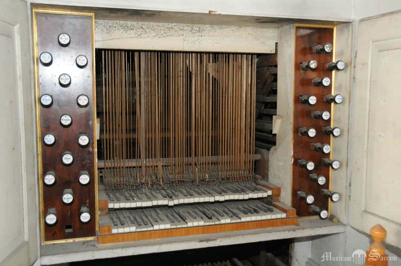 Trzy miechy klinowe usytuowane jeden nad drugim. Trzy dźwignie do kalikowania. Brak dmuchawy elektrycznej, ale w przeszłości instrument był w nią wyposażony. Za prospektem sekcja Hauptwerku, nad nią sekcja Oberwerku. Piszczałki sekcji pedału oraz miechy znajdują się w tylnej części szafy organowej.