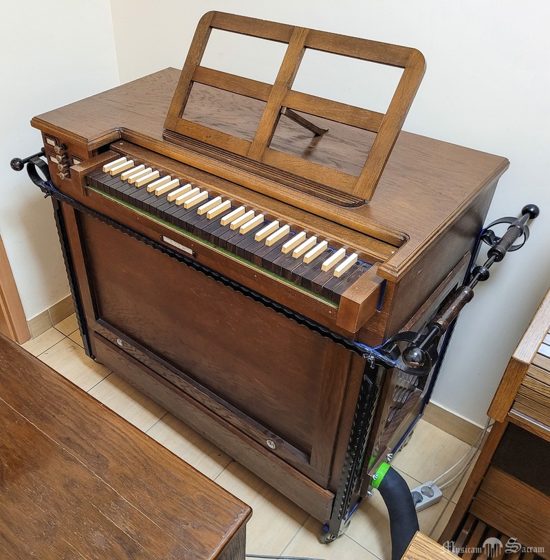 Pozytyw zbudowany został w 2007 r. przez Zakład Budowy, Renowacji i Naprawy Organów Damiana Kaczmarczyka z Zabrza. W latach późniejszych nieznany organmistrz wymienił największe piszczałki głosu Flet kryty 8' znajdujące się wewnątrz pozytywu na piszczałki zewnętrzne z lewej strony. Tylną ściankę instrumentu zdobią trzy prostokątne płyciny wypełnione ażurowym, złoconym ornamentem. W płycinie centralnej widnieje ponadto rzeźbiony i polichromowany herb miasta Krakowa. W 2022 r. zakład Damiana Kaczmarczyka dokonał potrzebnych reperacji i przywrócił pierwotny wygląd, chowając największe piszczałki do środka.