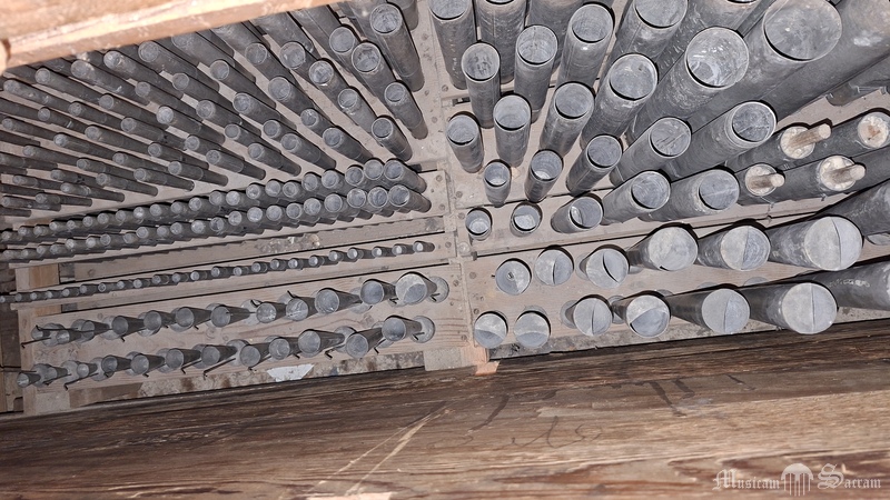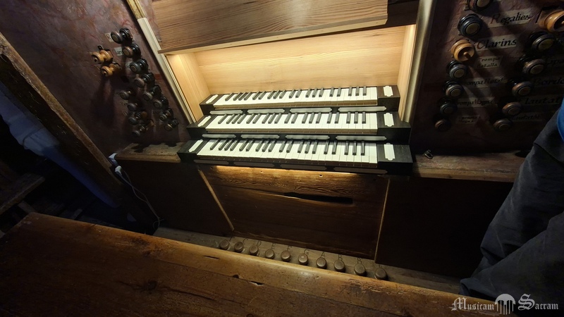 Ława organowa jest zintegrowana z pozytywem. Nad głową grającego znajduje się rzeźba, która osłania przed bezpośrednim dźwiękiem trąbek horyzontalnych.