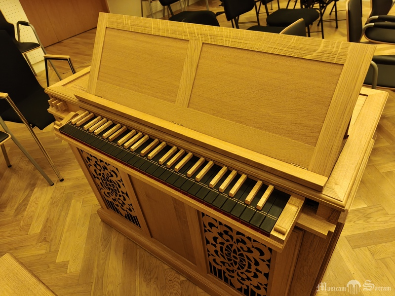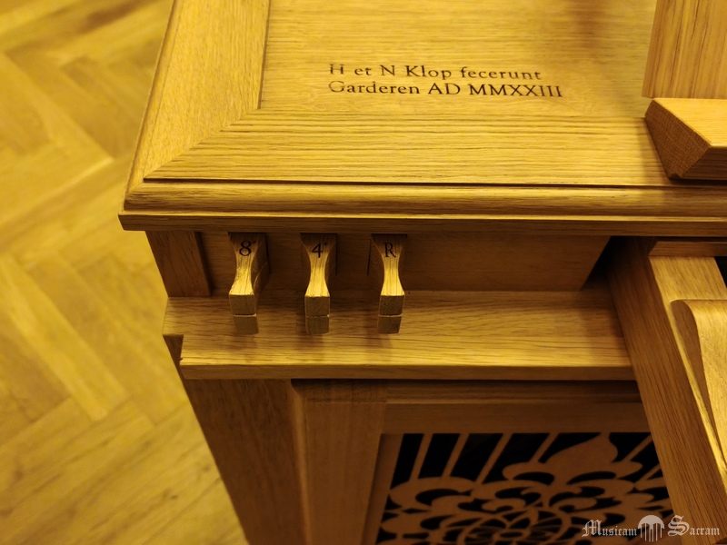 Wszystkie głosy są dzielone na część basową i dyszkantową. Skala manuału: C–f3.