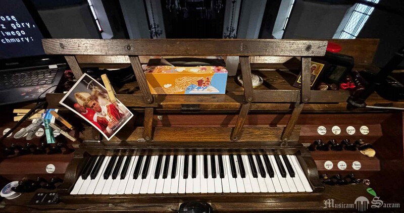 Instrument w stanie dobrym. Wymaga jedynie strojenia. Nazewnictwo częściowo oryginalne. Na wiatrownicy manuału jest wolne miejsce na dwa głosy, dla których przewidziano wolne manubria. Podobnie na wiatrownicy pedału jest jedno wolne miejsce wraz z manubrium, które obecnie uruchamia tremolo. Tabliczka budowniczego zaginęła podczas ostatniego remontu organów ok. 1995 r.