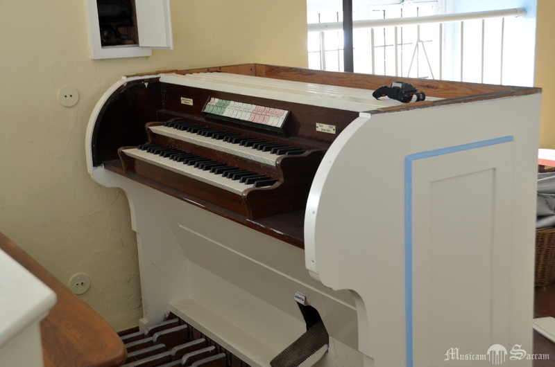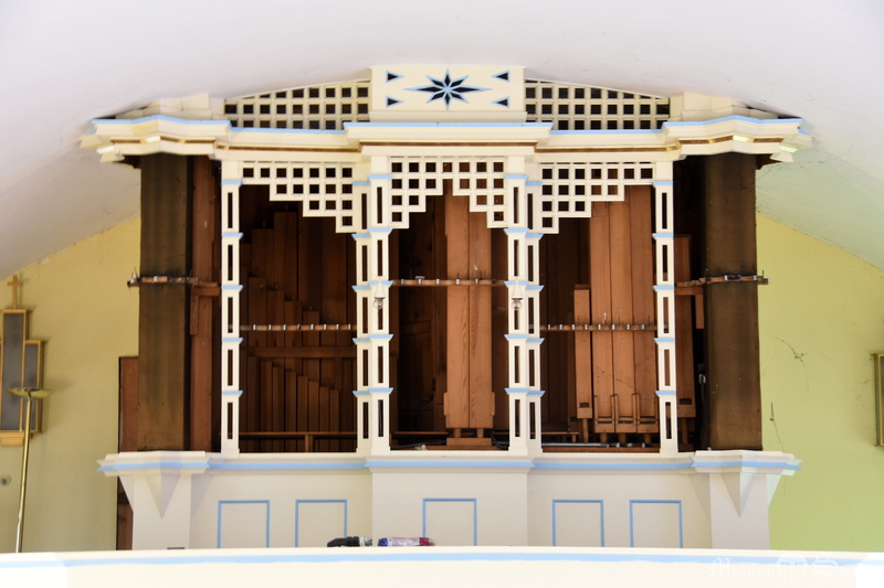 Organy zlokalizowane są w osi nawy, w jej zachodniej części. Stół gry znajduje się po lewej stronie szafy organowej. W pomieszczeniu nad kruchtą znajduje się dmuchawa i jeden miech magazunowy jednofałdowy. Drugi miech jest w szafie organowej.