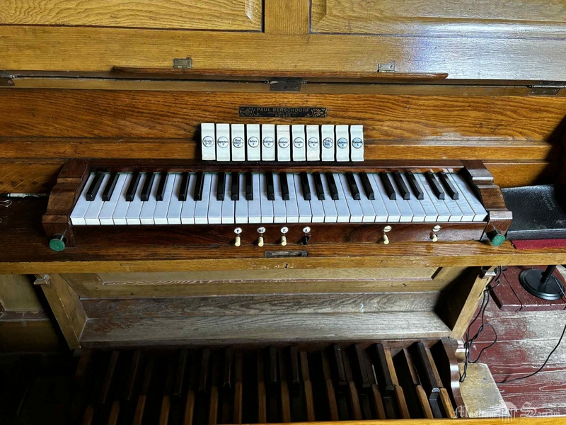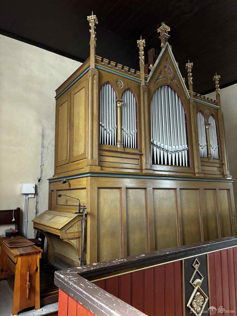 Instrument zbudowany przez firmę Paula Berschdorfa z Nysy, o czym świadczy tabliczka na stole gry. Nie jest to jego pierwotna lokalizacja, gdyż kościół został spalony w 1813 r. i pozostawał ruiną aż do 1960 roku, kiedy w celu jego odbudowy rozebrano pobliski kościół ewangelicki i przeniesiono część jego wyposażenia, w tym prawdopodobnie organy. W 2007 r. instrument był remontowany przez braci Broszko. Z warsztatu Berschdorfa pochodzą: wiatrownice, stół gry i system powietrzny oraz Subbass 16’. Pozostałe głosy pochodzą z różnych organów, m.in. Gedackt 8’ i Salicional 8’ z bazyliki w Krzeszowie.