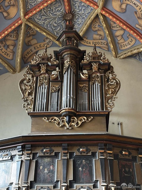 Organy wybudował Włodzimierz Truszczyński z Warszawy w miejsce wcześniejszego instrumentu Władysława Kaczmarka z 1949 r. Prospekt barokowy. Wiatrownice stożkowe. Dwa miechy pływakowe. Dmuchawa elektryczna ulokowana w wieży. Stół gry wolnostojący; grający siedzi tyłem do prezbiterium.
