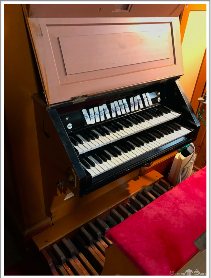 Stół gry jest wbudowany w północny bok szafy organowej. Posiada dwa manuały o zakresie C-f3. Klawiatura pedałowa ma zakres od C-d1. Włączniki registrowe podłużne w formie uchylnych klapek z nazwą głosu lub funkcją włącznika.