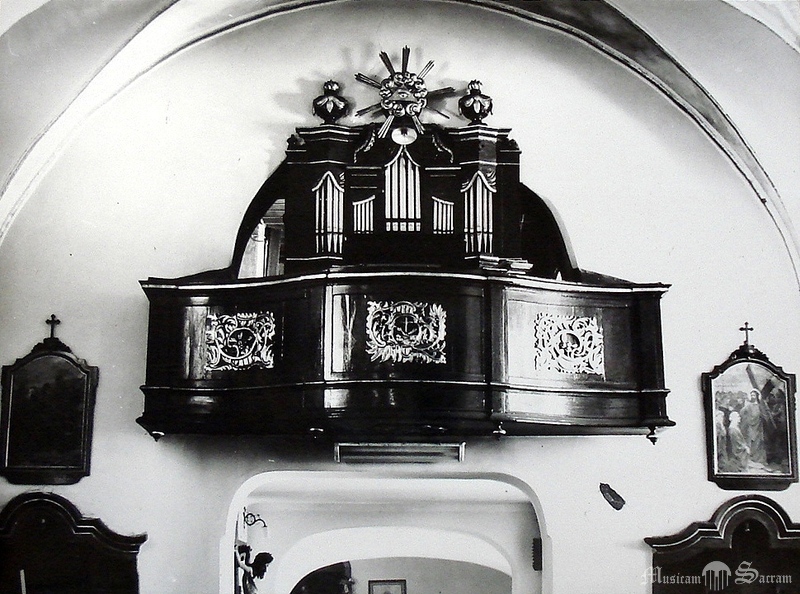 Prospekt organowy w części zabytkowej klasycystyczny (w odmianie ludowej), jednosekcyjny, pięciopolowy. Za bocznymi członami prospektu stoją, z podziałem na strony C i Cis, trzy głosy z sekcji manuału II: Aeolina 8’, Kwintaton 4’ i Tercja 1 3/5’.