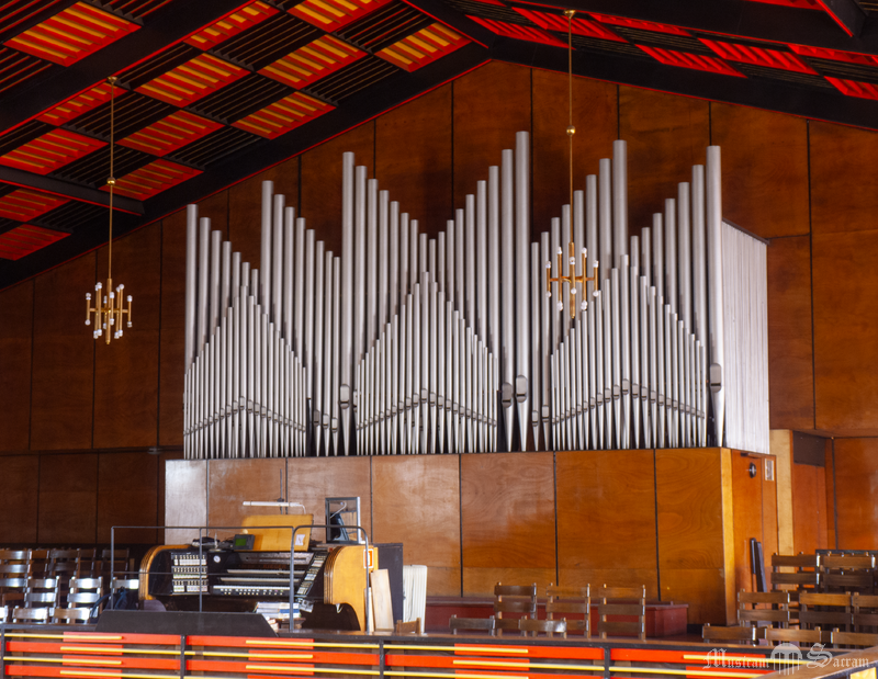 Wiatrownice stożkowe. Grający siedzi tyłem do prezbiterium. Prospekt utrzymany w formach modernistycznych, składający się z przenikających się nawzajem pól piszczałkowych, tworzących układy geometryczne. Sekcje manuałów II oraz III umieszczone są w szafach ekspresyjnych. Obecnie instrument jest w bardzo dobrym stanie [03.2015]. W lipcu 2014 roku zakończył się gruntowny remont generalny, który wykonał Olgierd Nowakowski z Zabrza. Inwestycja została przeprowadzona dzięki ofiarności parafian, kosztowała około 195 tysięcy złotych.